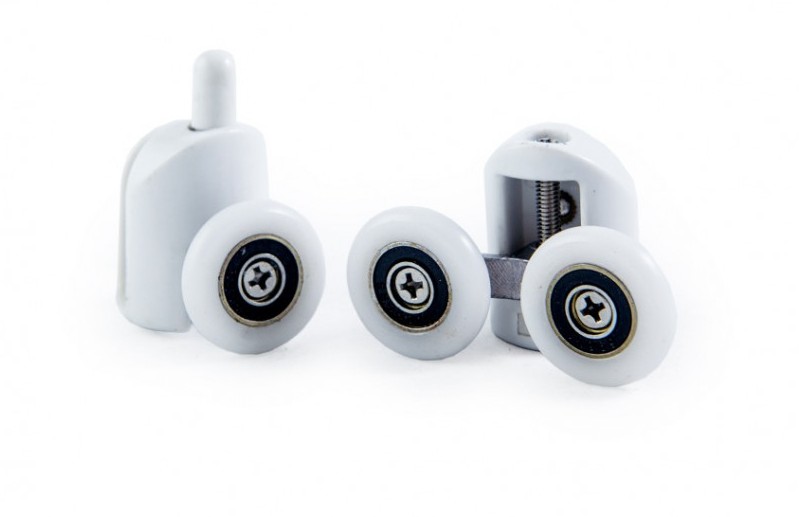 Смешанный набор роликов для душевой кабины DC 1005: одинарные и двойные ролики со съемными колесами, диаметр колесика — 23 мм. В наборе — 8 штук: 4 верхних ролика, 4 нижних. Ролики оснащены кнопочным креплением под 1 отверстие, диаметр монтажного отверстия — от 10 до 12 мм. Подходят для стекол толщиной до 5 мм. В верхних роликах есть регулировочный винт для настройки, нижние ролики оснащены прижимной клипсой.