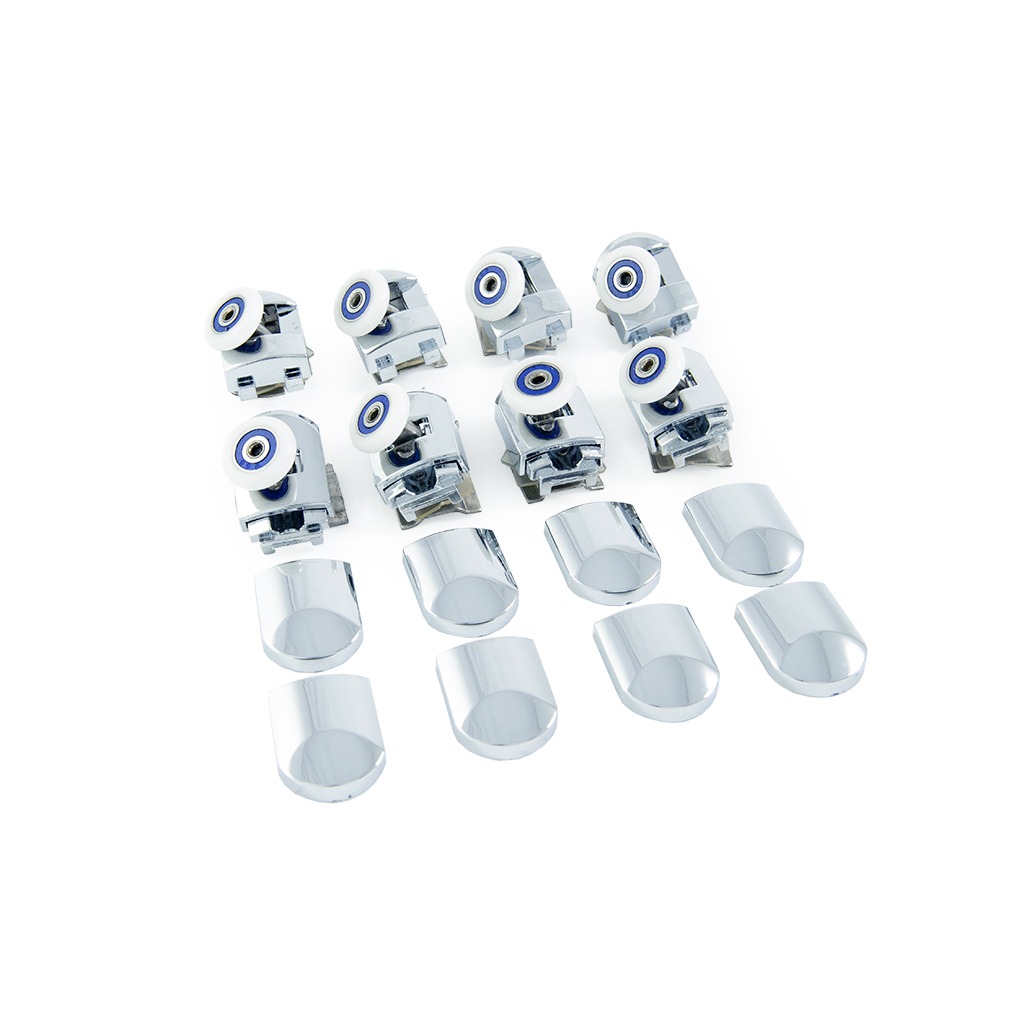 Набор одинарных металлических роликов для душевой кабины DC 1008M с диаметром колеса 23 мм. Ролики этой модели отличаются конструкцией кнопочного крепления: нажимной механизм спрятан внутри корпуса. В наборе — 8 роликов: 4 верхних, 4 нижних. Диаметр монтажного отверстия — от 10 до 12 мм, подходят для стекол толщиной до 6 мм. В верхних роликах есть регулировочный винт для настройки.