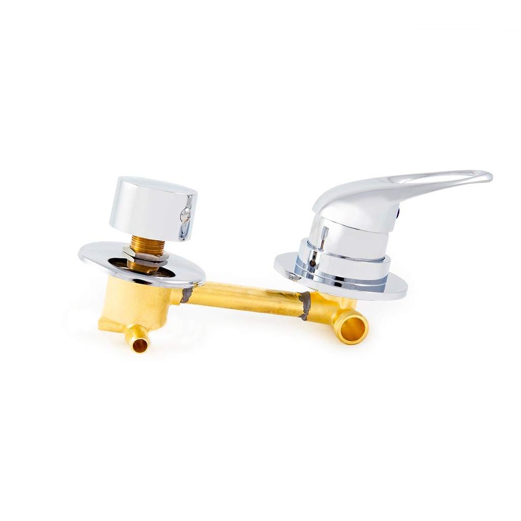 Поставляется в заводской сборке с металлическими хромированными ручками и монтажными креплениями (прижимными гайками). Подключение горячей и холодной воды выполнено под гайку 1/2 дюйма, подключение узла переключения режимов — под хомут (штуцер под шланг c внутренним сечением 10 мм), расстояние между центрами ручек — 120 мм. Корпус смесителя изготовлен из латуни, соединительная труба — впаянная латунная.