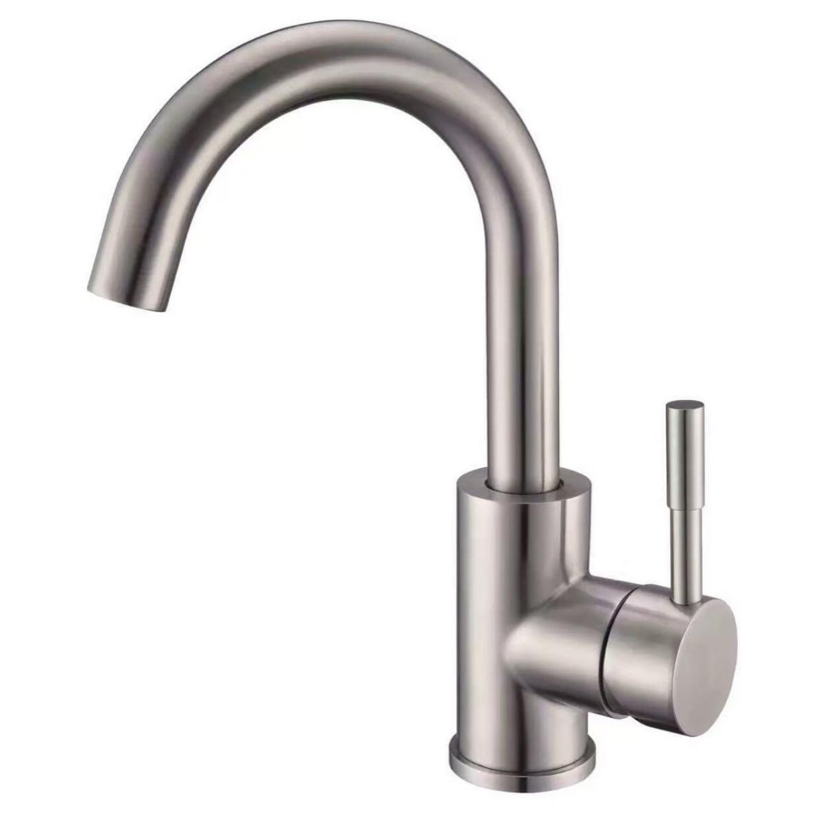 Одноручковый смеситель для умывальника из нержавеющей стали с высоким изливом станет привлекательным и функциональным атрибутом ванной комнаты.