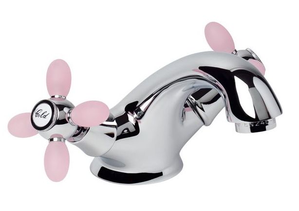 Смеитель для умывальника СПЕКТР: керамические кранбуксы 1/2", хpомир., цвет маховика розовый, трубчатый излив L180,