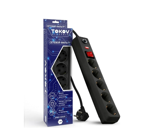 Удлинитель с сетевым фильтром 5х1.8м с заземл. с выкл. 16А с защ. от скачков напр. и перегрузок 3х1 черный TKE-C06-SF5-1.8-ZV
