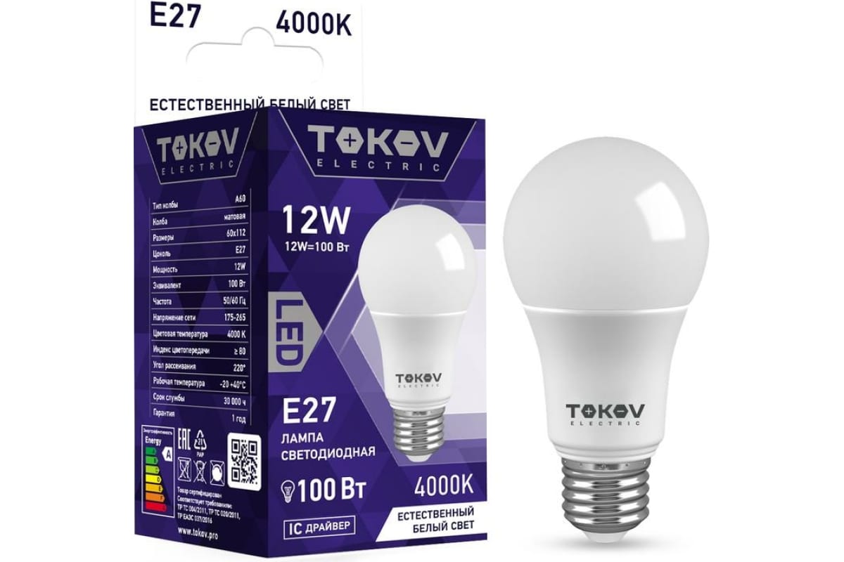 Лампа светодиодная 12Вт А60 4000К Е27 176-264В TOKOV ELECTRIC TKE-A60-E27-12-4K