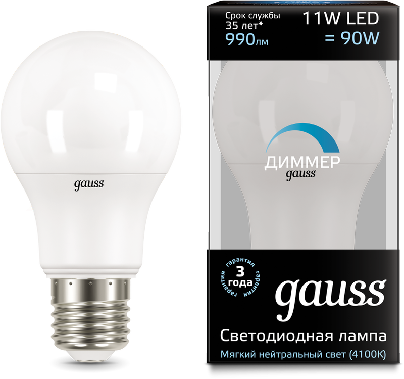 Лампа Gauss LED A60-dim E27 11W 990lm 4100К диммируемая 1/10/50
