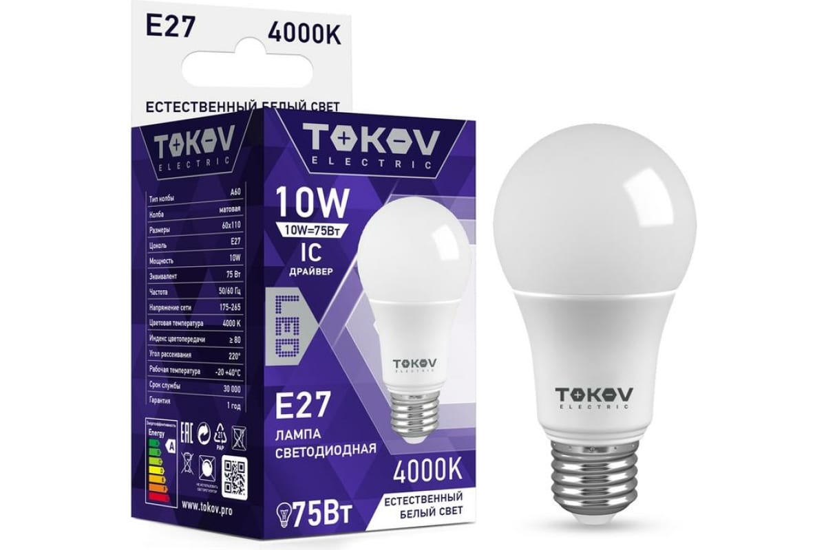 Лампа светодиодная 10Вт А60 4000К Е27 176-264В TOKOV ELECTRIC TKE-A60-E27-10-4K