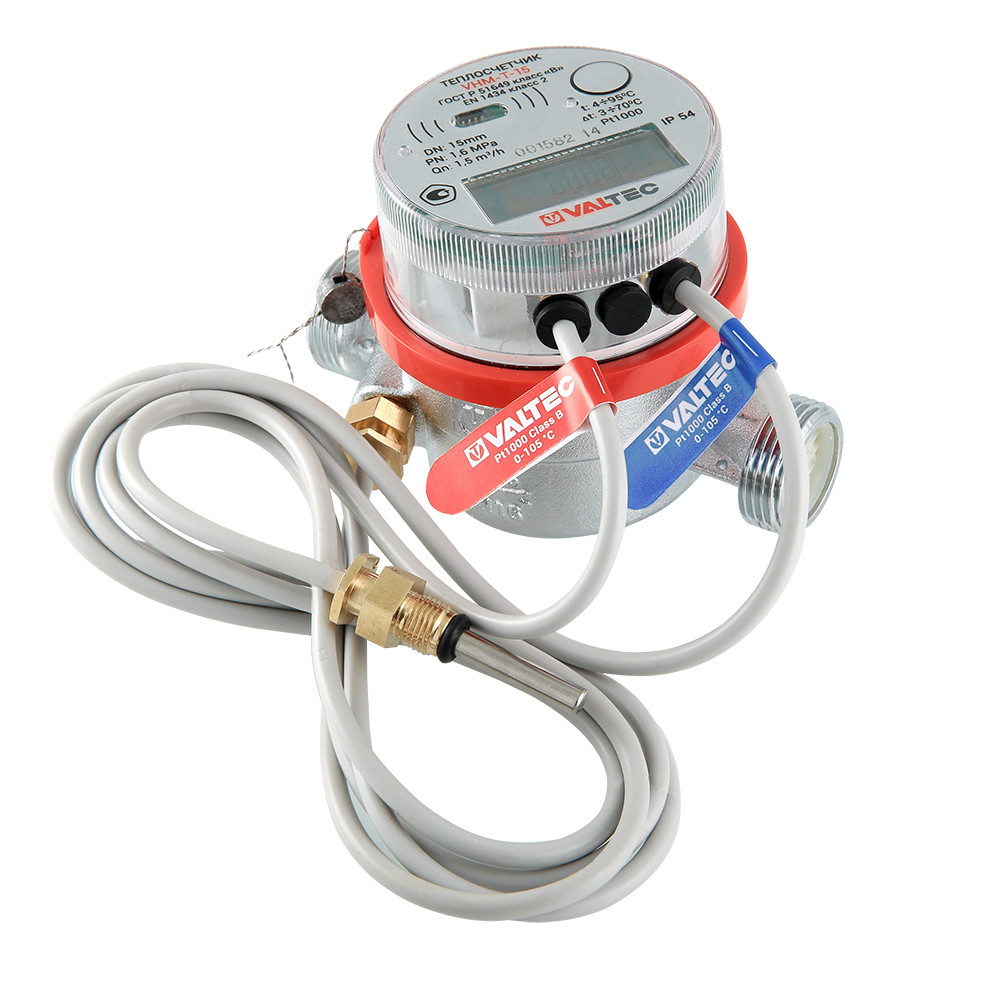 (VHM-T) Теплосчетчик предназначен для коммерческого учета тепловой энергии в водяных системах отопления и горячего водоснабжения, соответствует требованиям ГОСТ Р 51649. Квартирный теплосчетчик VALTEC VHM-T состоит из одноструйного тахометрического расходомера с латунным никелированным корпусом, двух платиновых датчиков температуры Pt 1000 (в комплекте – адаптеры на М10), электронного тепловычислителя с энергонезависимой памятью, архивом данных глубиной до 8 лет, встроенными часами наработки. Класс точности прибора – B. Межповерочный интервал – 4 года. Срок службы – 12 лет. Гарантия – 36 месяцев от даты продажи.