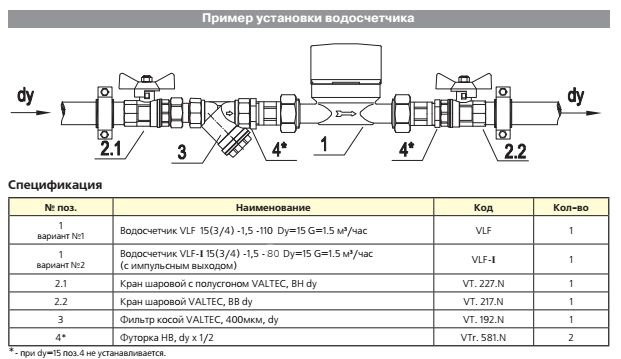 (VLF-15U-I) Водосчетчик универсальный – для измерения расхода холодной и горячей воды, главным образом – в квартирах. Условный диаметр модели – 1/2"; номинальный расход воды – 1,5 куб. м/ч. Длина прибора без сгонов – 80 мм. Резьба присоединительных патрубков – 3/4".