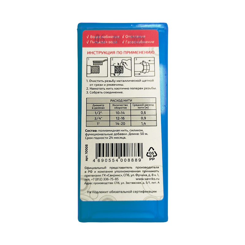 Применяется для всех типов металлических и пластиковых труб и фитингов диаметром до 6 дюймов. Нить устойчива к воздействию температур от -20С до +130С и давления до 16 бар для воды и до 8 бар для газа.