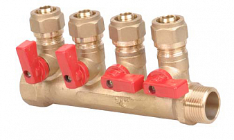 Коллектор прямой с шар.кранами, латунь, 3/4", 4 выхода евроц. 16, красн. ручка