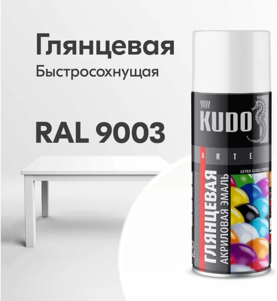 KUDO краска аэрозольная универсальная (520 мл) белая быстросохнущая акриловая глянцевая RAL 9003 белая KU-A9003M