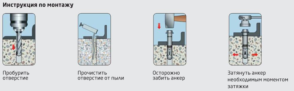 Для установки болта необходимо предварительное просверливание отверстия в основании и прикрепляемом материале, после чего происходит затягивание гайкой.