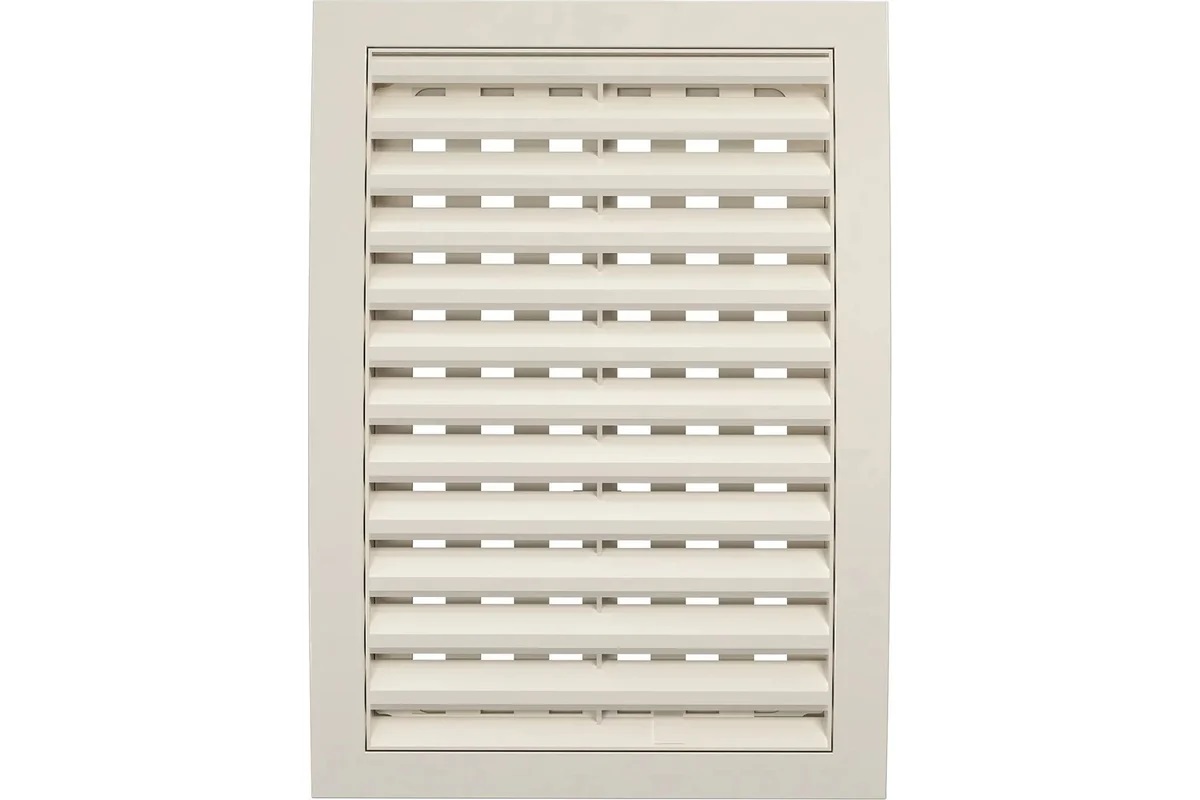 Разъемная решетка РРП оснащена подвижными частями для регулировки потока воздуха, нужное положение выбирается перемещением флажка. Наклонные жалюзи скрывают шахту вентиляции и придают ей эстетичный вид. Доступна в белом цвете и Ivory.